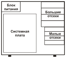 Большие отсеки, расположенные сверху, необходимы для больших по размеру устройств чтения-записи компакт дисков. Малые отсеки, расположенные
